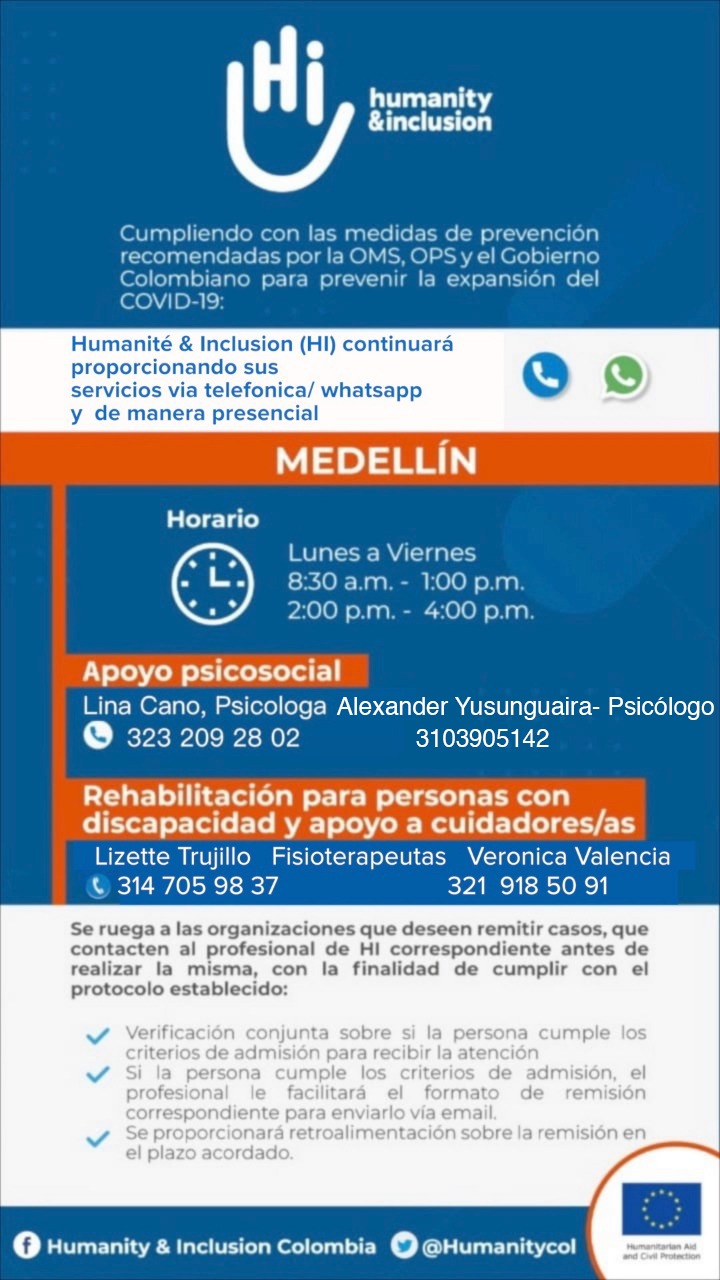Comité de Rehabilitación de Antioquia: Atención presencial para los componentes de Rehabilitación Física y Apoyo psicosocial, de Lunes a Jueves desde las 8:00 am – 4:00 pm .