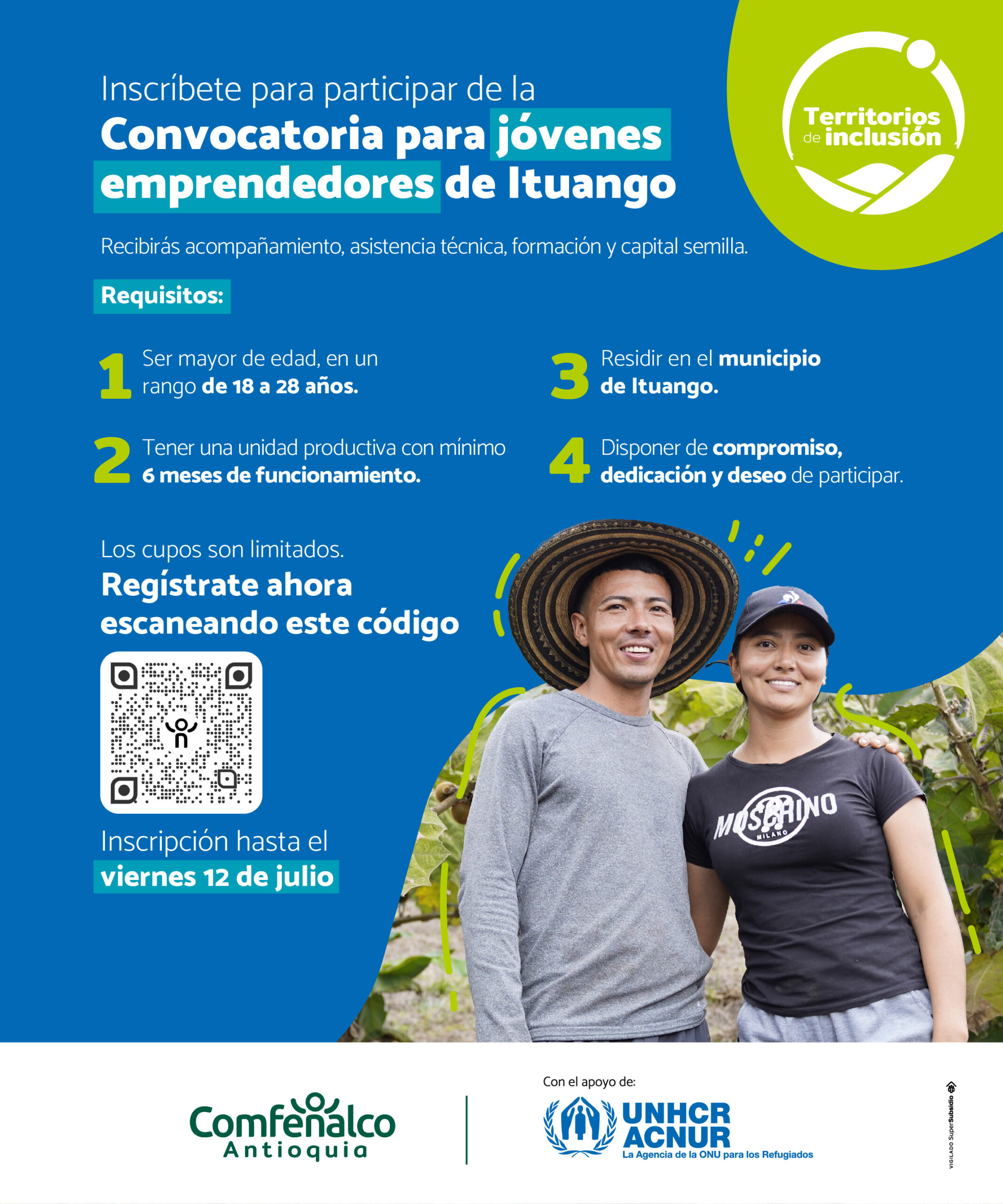 Desde la estrategia Territorios de inclusión de Comfenalco Antioquia y la Agencia de la ONU para los refugiados ACNUR, te invitamos a participar de este proceso de acompañamiento para jóvenes emprendedores del municipio de Ituango.